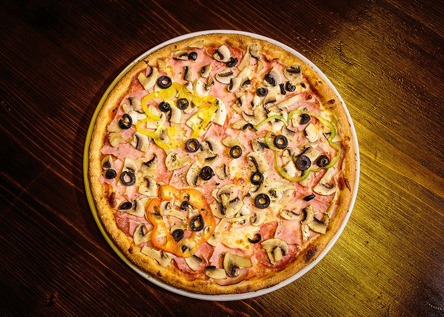 Ingrediente: Blat, Sos de roșii, Mozzarella, Salam crud-uscat, Șuncă de Praga, Ciuperci proaspete, Oregano